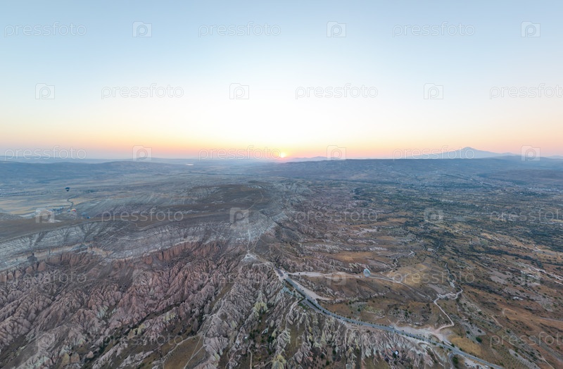 Восходящее солнце освещает огромное плато Каппадокии и эрозированные долины теплым золотым светом, на расстоянии видны воздушные шары с горячим воздухом