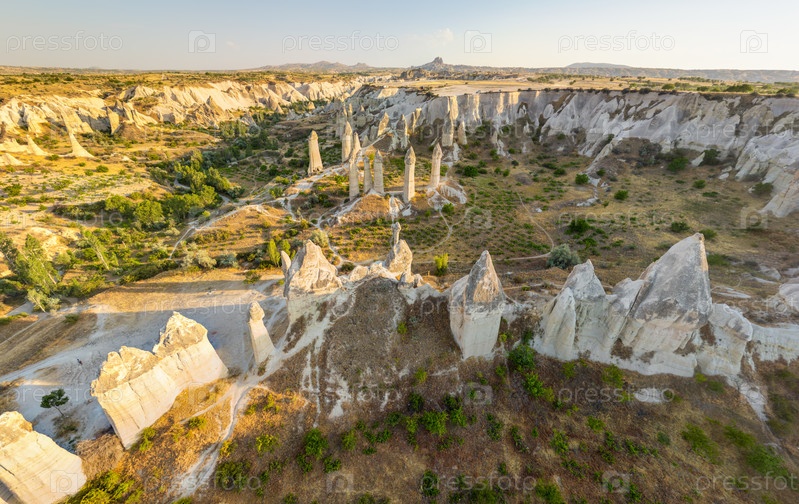 Goreme, Nevsehir, Турция. обширный взгляд с воздуха на Долину Любви, захватывающий огромную местность каньона, эрозированные склоны и смотровую зону Lovers Hill, купающуюся в золотом свете заката солнца