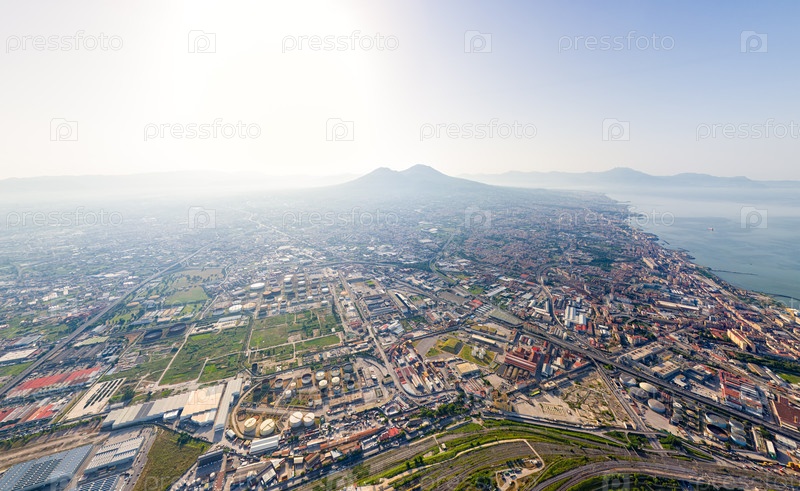 Неаполь, Италия. Вулкан Везувий в фоновом свете. Панорама города летом. Солнечная погода. Вид с воздуха