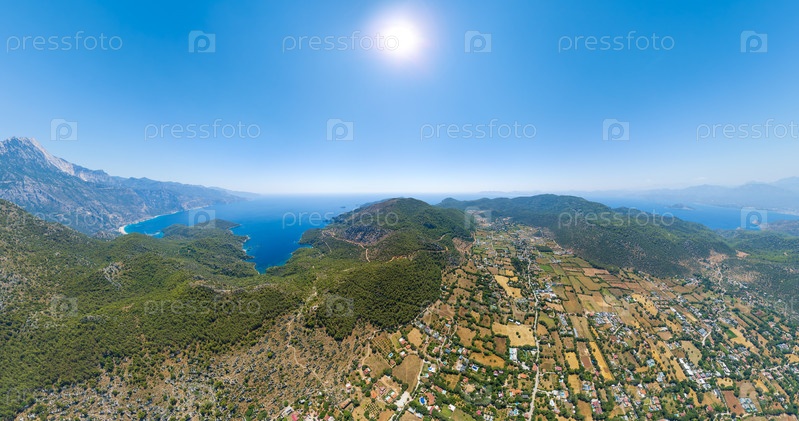 Панорамная аэрофотосъемка, показывающая средиземноморский пейзаж с лесистыми склонами, сельскохозяйственными полями и дальним видом на море при ярком дневном свете