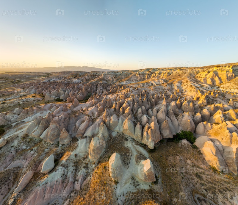 Гореме, Невшехир, Турция. Широкий панорамный вид с беспилотного летательного аппарата на Долину Деврента при закате солнца летом. Сказные дымоходы и уникальные скальные образования, купающиеся в золотистом свете. Вид с воздуха