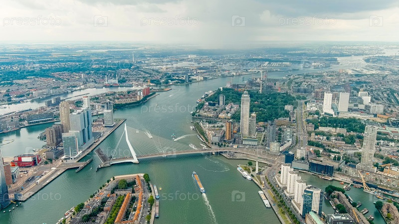 Роттердам, Нидерланды. Эразмусский мост. Остров Нордерейланд. Вид на центр города. Река Новая Маас. Летний день, дождливые облака, Aerial View