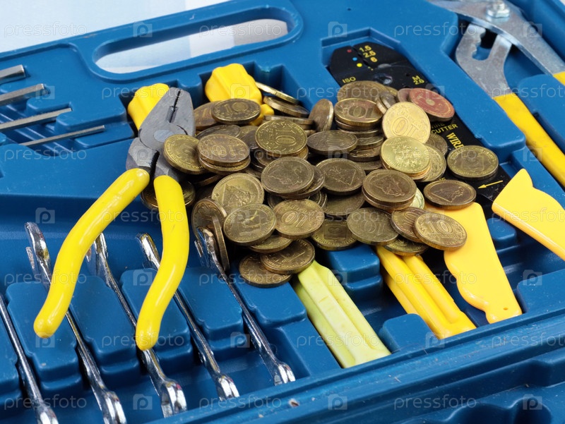 Набор строительных инструментов и кучу металлических монет как способ заработать деньги при ремонте дома