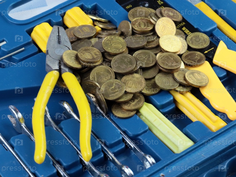 Набор строительных инструментов и кучу металлических монет как способ заработать деньги при ремонте дома