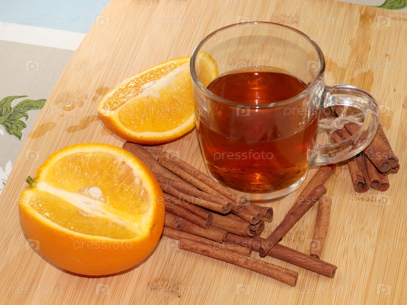 Зрелый апельсин и кусок палочек корицы лежат рядом со стаканом зеленого чая