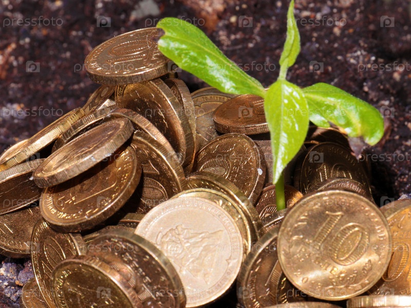 Кучу металлических монет и нежный зеленый побег