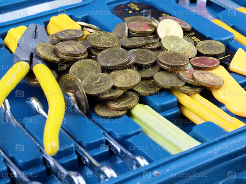 Набор строительных инструментов и кучу металлических монет как способ заработать деньги при ремонте дома