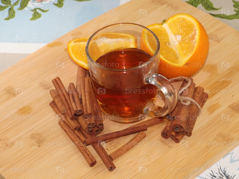 Зрелый апельсин и кусок палочек корицы лежат рядом со стаканом зеленого чая