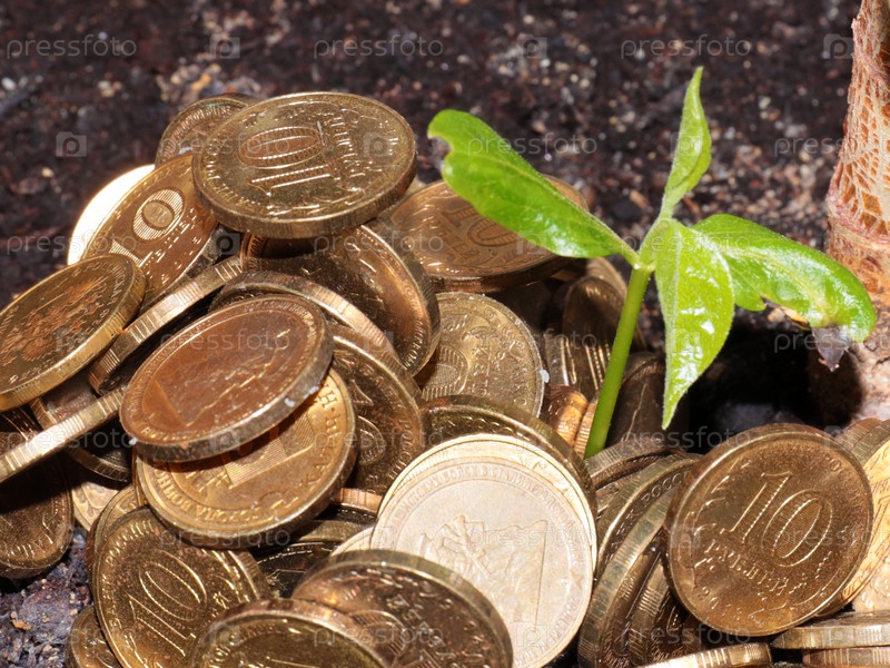 Кучу металлических монет и нежный зеленый побег