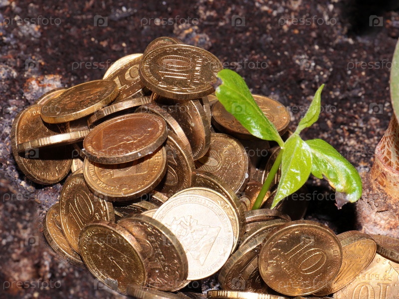Кучу металлических монет и нежный зеленый побег