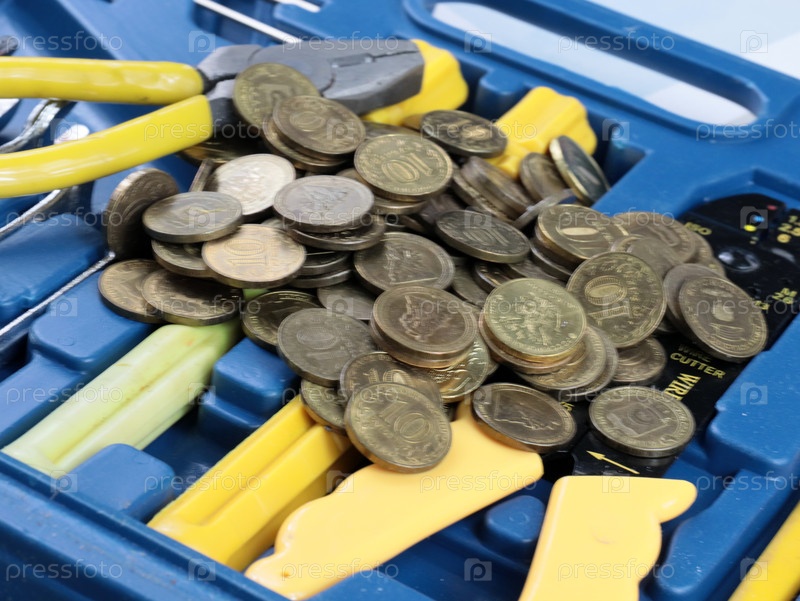 Набор строительных инструментов и кучу металлических монет как способ заработать деньги при ремонте дома