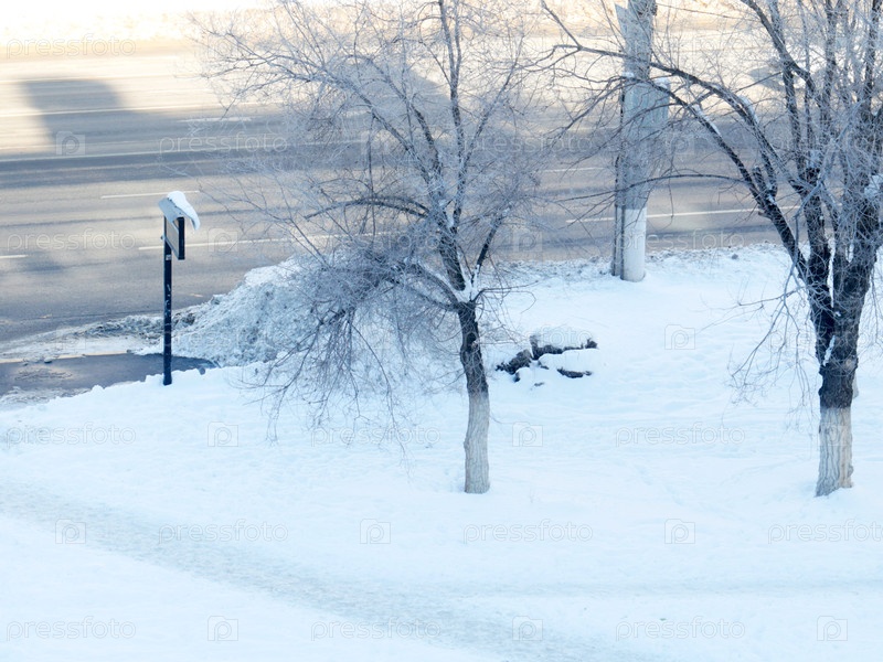 Знак пассажирского транспорта на заснеженной автобусной остановке
