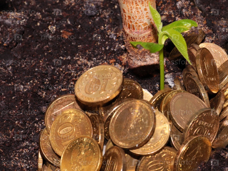 Кучу металлических монет и нежный зеленый побег