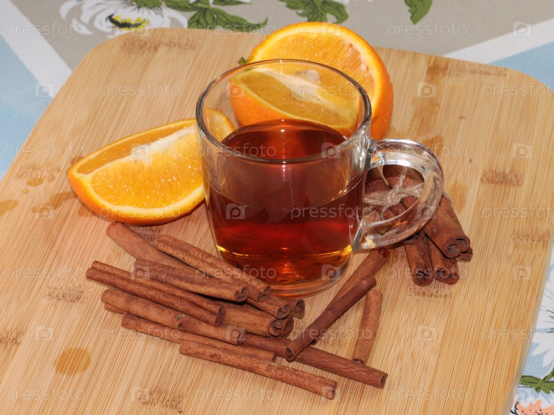 Зрелый апельсин и кусок палочек корицы лежат рядом со стаканом зеленого чая