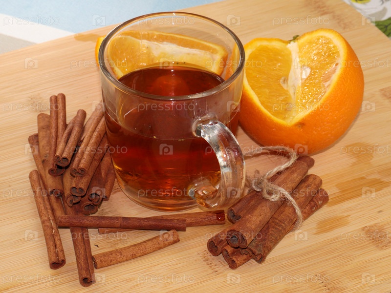 Зрелый апельсин и кусок палочек корицы лежат рядом со стаканом зеленого чая