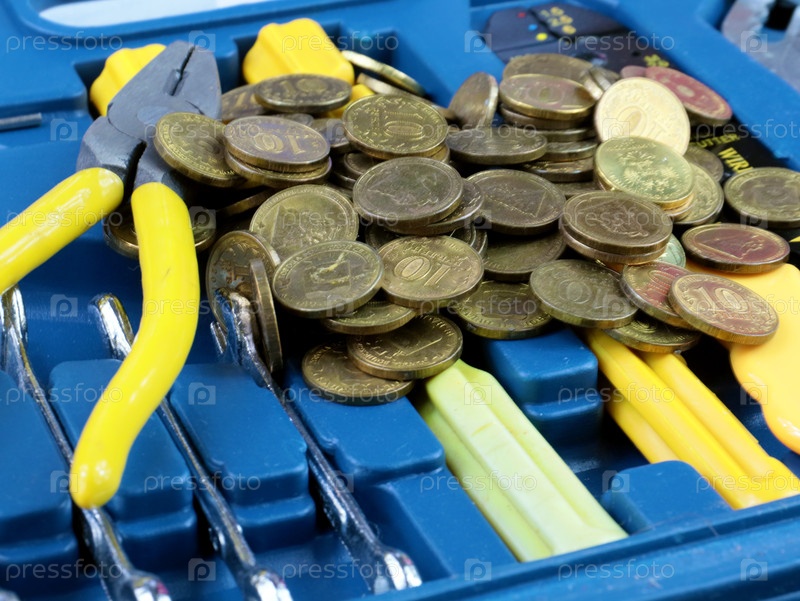 Набор строительных инструментов и кучу металлических монет как способ заработать деньги при ремонте дома