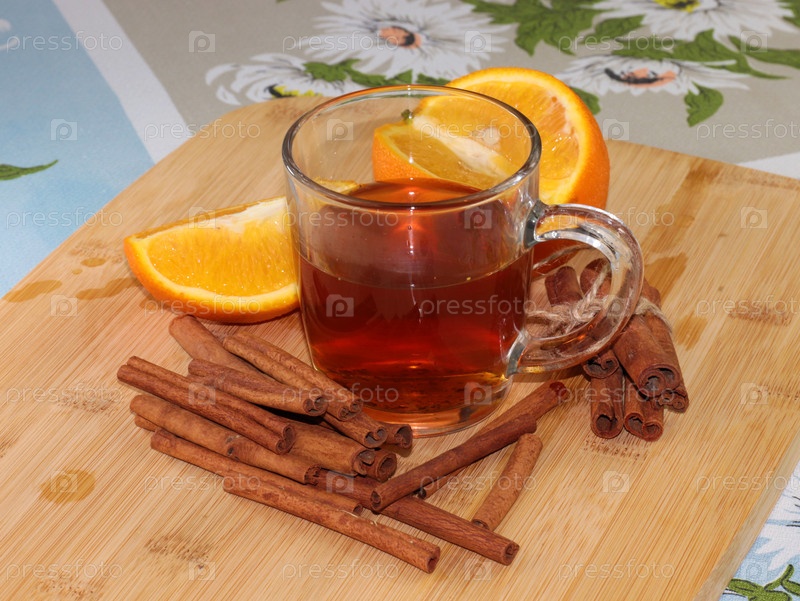 Зрелый апельсин и кусок палочек корицы лежат рядом со стаканом зеленого чая