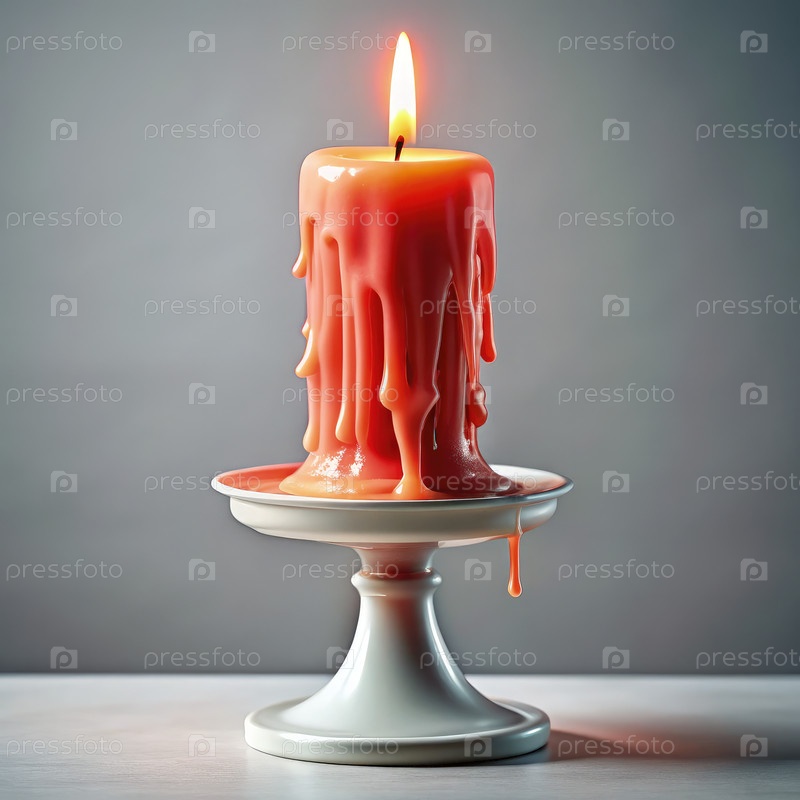 Яркая коралловая свеча с расплавленным воском на декоративном держателе при теплом освещении