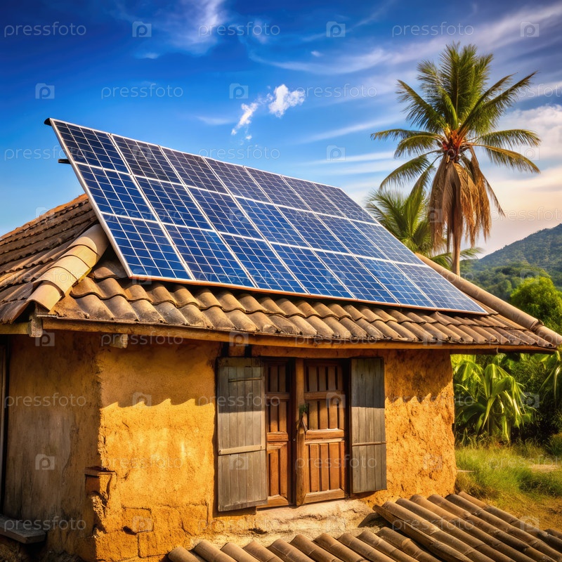 Солнечные батареи на крыше деревенского дома среди пышной зелени в сельской местности
