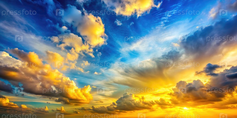 Драматическое облачное небо на закате с яркими желтыми и синими оттенками