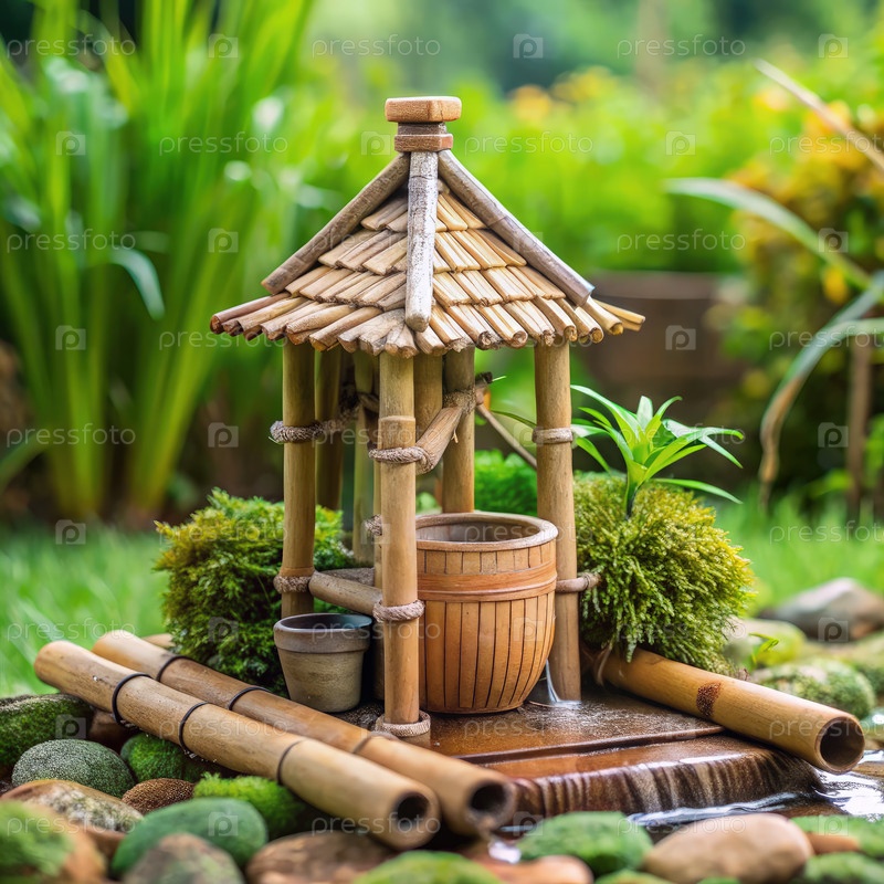 Миниатюрная бамбуковая каюта-фонтан в тихой садовой обстановке с пышной зеленью