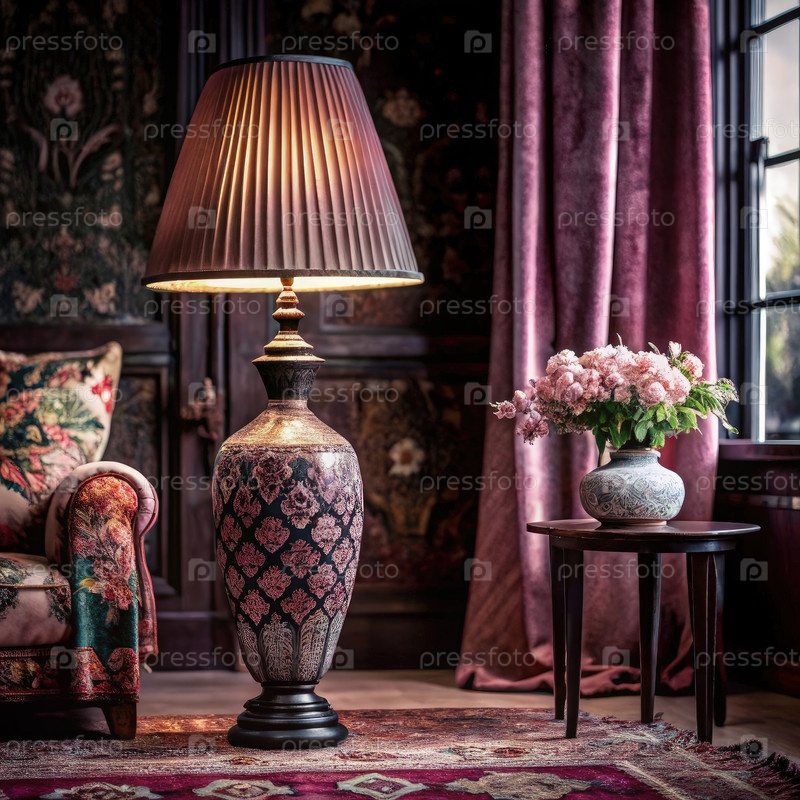 Шикарная гостиная со стильной лампой и цветочной вазой