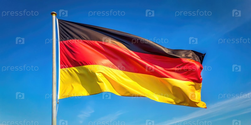 Немецкий флаг, размахивающий против чистого синего неба в яркий солнечный день