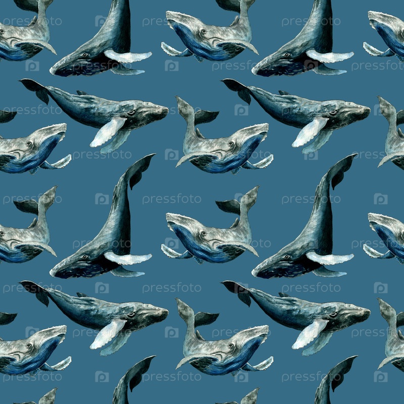 Бесшовный рисунок китов. Ручная иллюстрация акварели. Дизайн для ткани, настенных покрытий, открыток, приглашений, бумаги для скрапбука