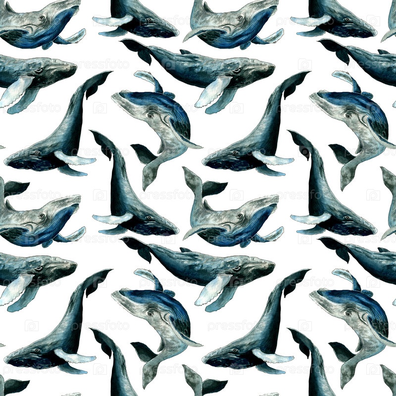Бесшовный рисунок китов. Ручная иллюстрация акварели. Дизайн для ткани, настенных покрытий, открыток, приглашений, бумаги для скрапбука