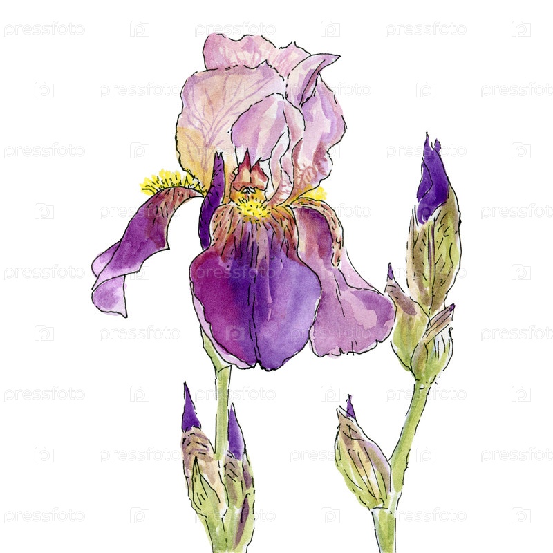 Рука рисует акварельный ирис в стиле эскиз на белом фоне.Дизайн для печати на сумке или наклейках
