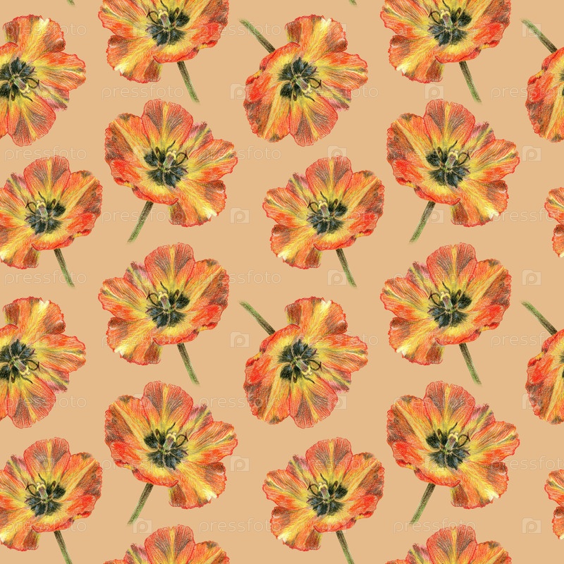 Тюльпаны без швов рисуют цветными карандашами.Дизайн для ткани, настенных покрытий, открыток, приглашений, бумаги для скрапбуков