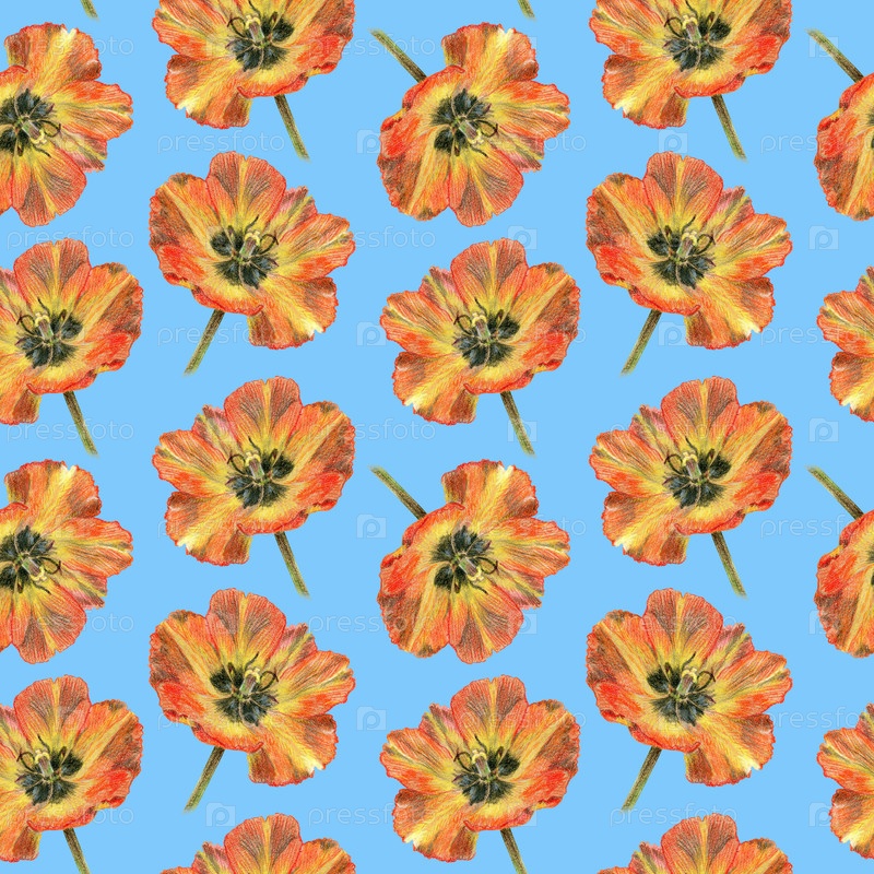 Тюльпаны без швов рисуют цветными карандашами.Дизайн для ткани, настенных покрытий, открыток, приглашений, бумаги для скрапбуков