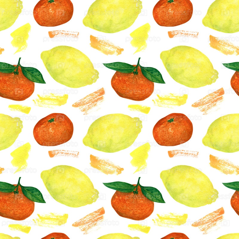 Акварель бесшовный рисунок. Мандаринки, лимоны и абстрактные пятна акварели на белом фоне. Дизайн для ткани, стеновых покрытий, открыток, приглашений, бумаги для скрапбука или упаковочной бумаги