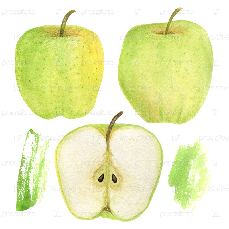Акварель руками рисует яблоки и абстрактные пятна на белом фоне.Дизайн для открытки, приглашения или печати на ткани