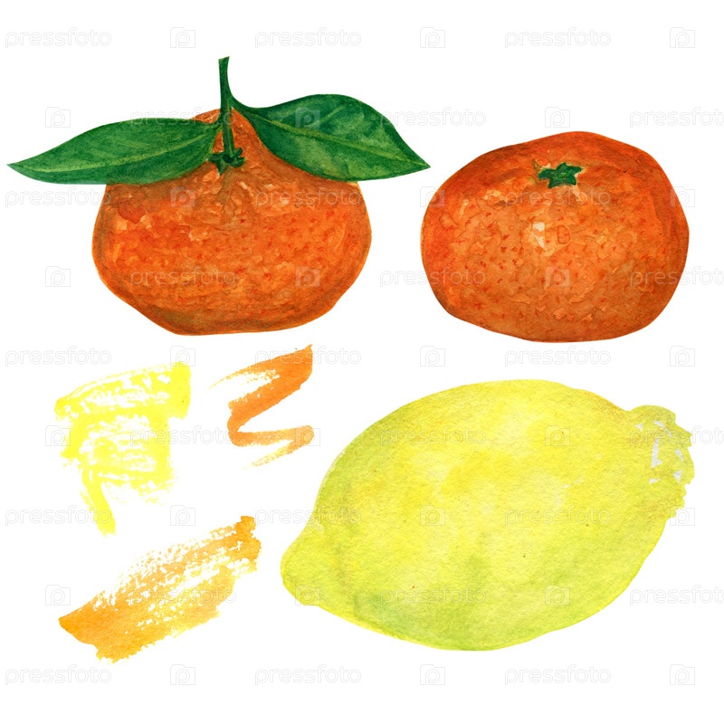 Акварель рукой рисует мандарины, лимон и абстрактные пятна на белом фоне.Дизайн для открыток, приглашений или печати на ткани