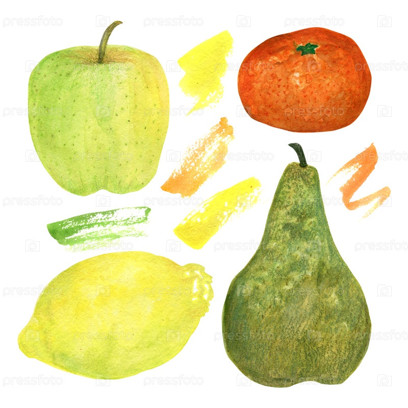 Акварель рукой рисует яблоко, грушу, мандарину, лимон и абстрактные пятна на белом фоне. дизайн для открыток, приглашений или печати на ткани