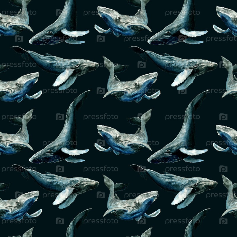 Бесшовный рисунок китов. Ручная иллюстрация акварели. Дизайн для ткани, настенных покрытий, открыток, приглашений, бумаги для скрапбука