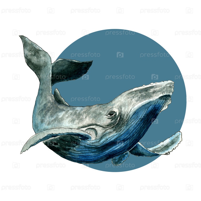 Акварель кита на абстрактном пятне. Стиль эскиза. Дизайн для открытки, печать на сумке или футболке