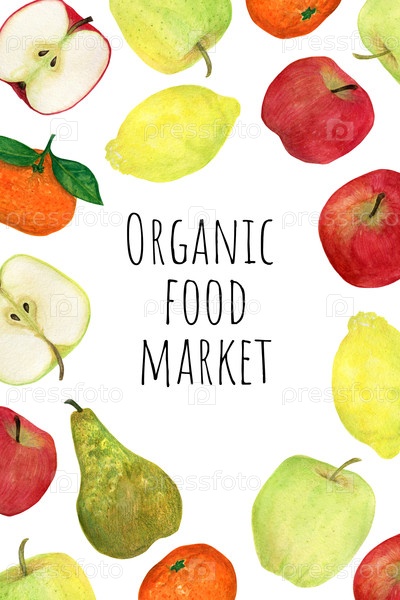 Акварельный плакат с яблоками, лимонами, мандаринами и грушами