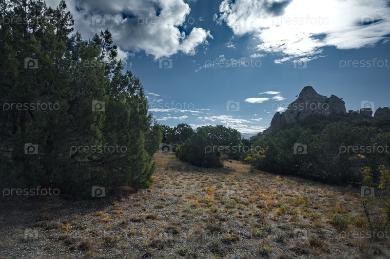 Россия, Новый Свет. Живописный вид на побережье Черного моря с горы в окрестностях знаменитого мыса Капчик на Крымском полуострове