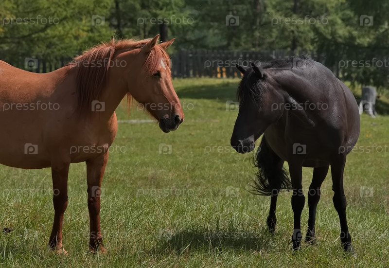 Россия. Западный Саян. Республика Бурятия. Небольшое стадо лошадей мирно пасется на пышном пастбище возле буддийского дацана недалеко от деревни Орлик