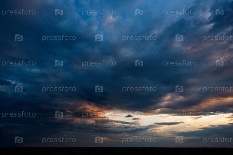 Россия. Юг Западной Сибири. Панорама вечернего летнего неба с разноцветными облаками над полями