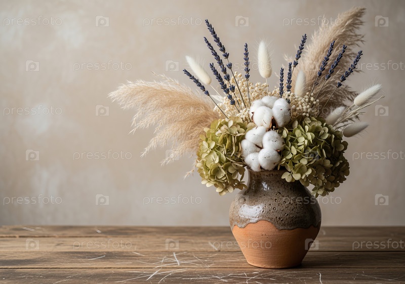 Шикарный букет сухих цветов в глиняной вазе в деревенском стиле на деревянном столе с мягким естественным освещением