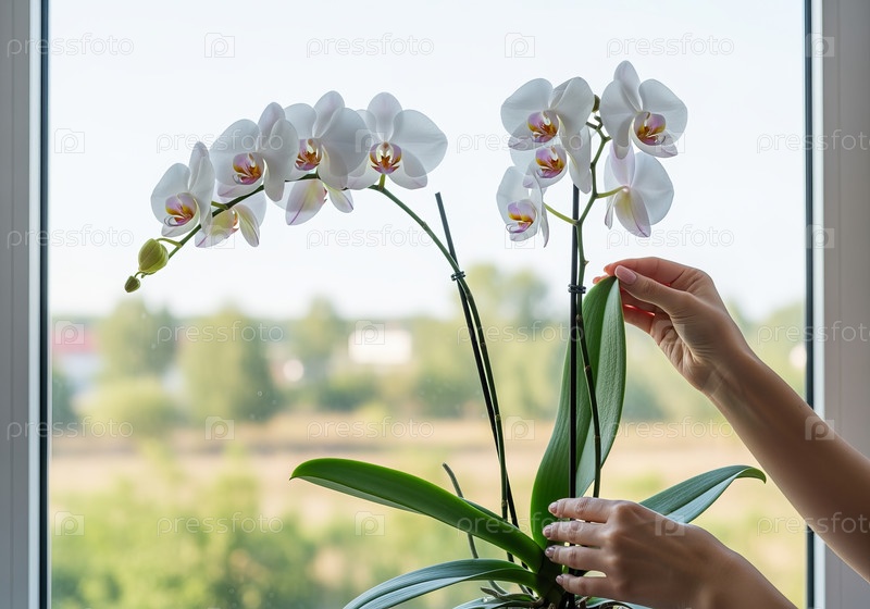 Безмятежное утро, цветущую орхидею на подоконнике поправляют нежные женские руки
