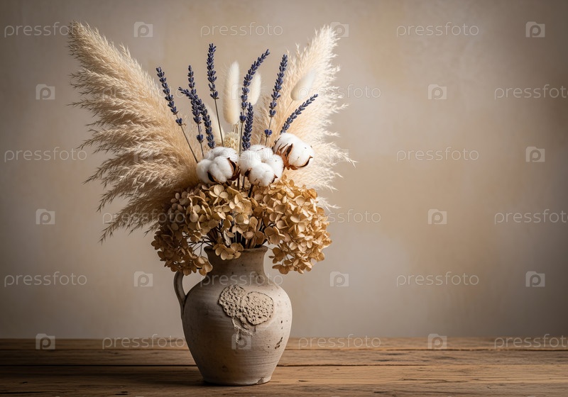 Стильный букет сухих цветов в деревенской вазе на деревянном столе на фоне текстурированной бежевой стены