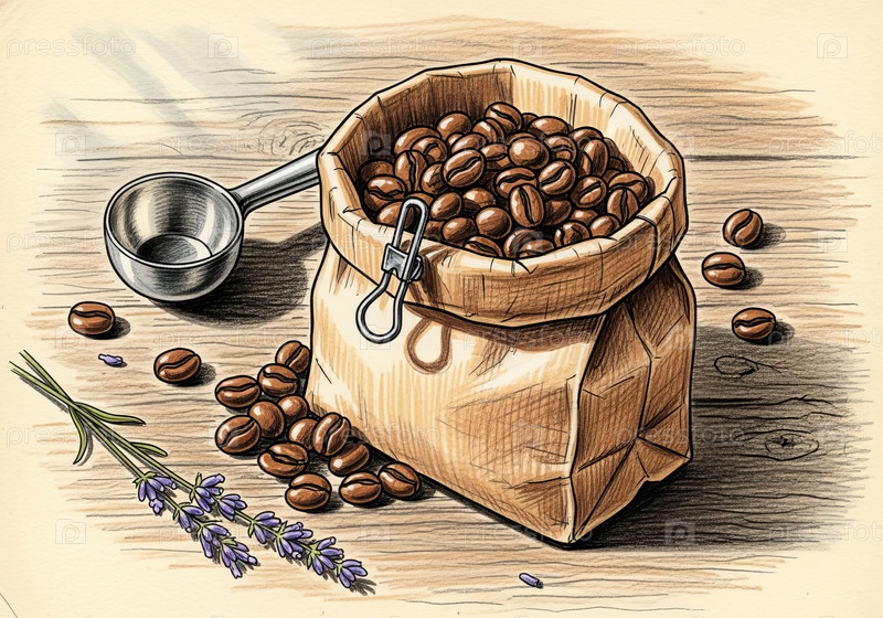 Нарисованная от руки иллюстрация крафтового бумажного пакета с кофейными зернами и запечатывающим зажимом