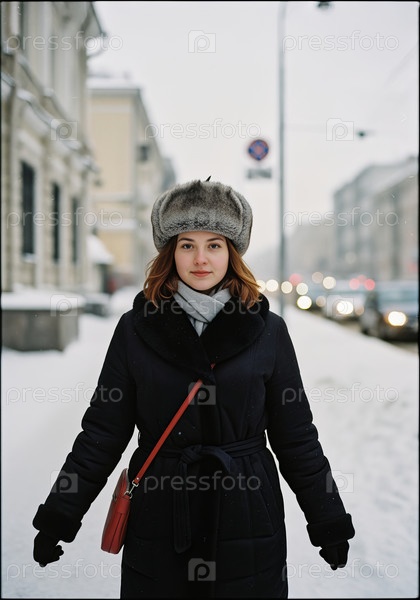 Молодая женщина в винтажной советской шапке-кубанке на заснеженной городской улице, эстетика 1990-х годов