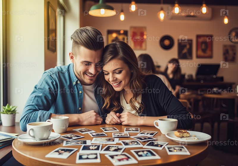 Искренняя радость молодой пары, наслаждающейся ностальгическими полароидными снимками в уютной обстановке ретро-кафе