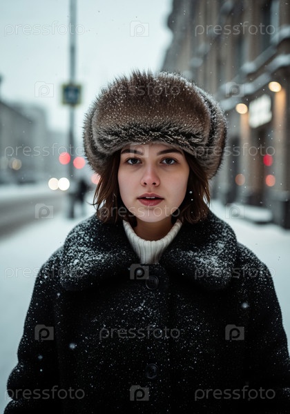 Портрет молодой женщины в винтажной советской шапке-кубанке на заснеженной городской улице, эстетика 1990-х годов