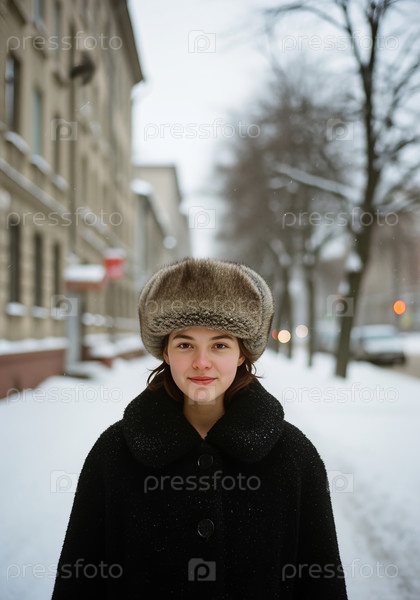 Молодая женщина в винтажной советской шапке-кубанке прогуливается по заснеженной городской улице, ностальгия по 1990-м годам